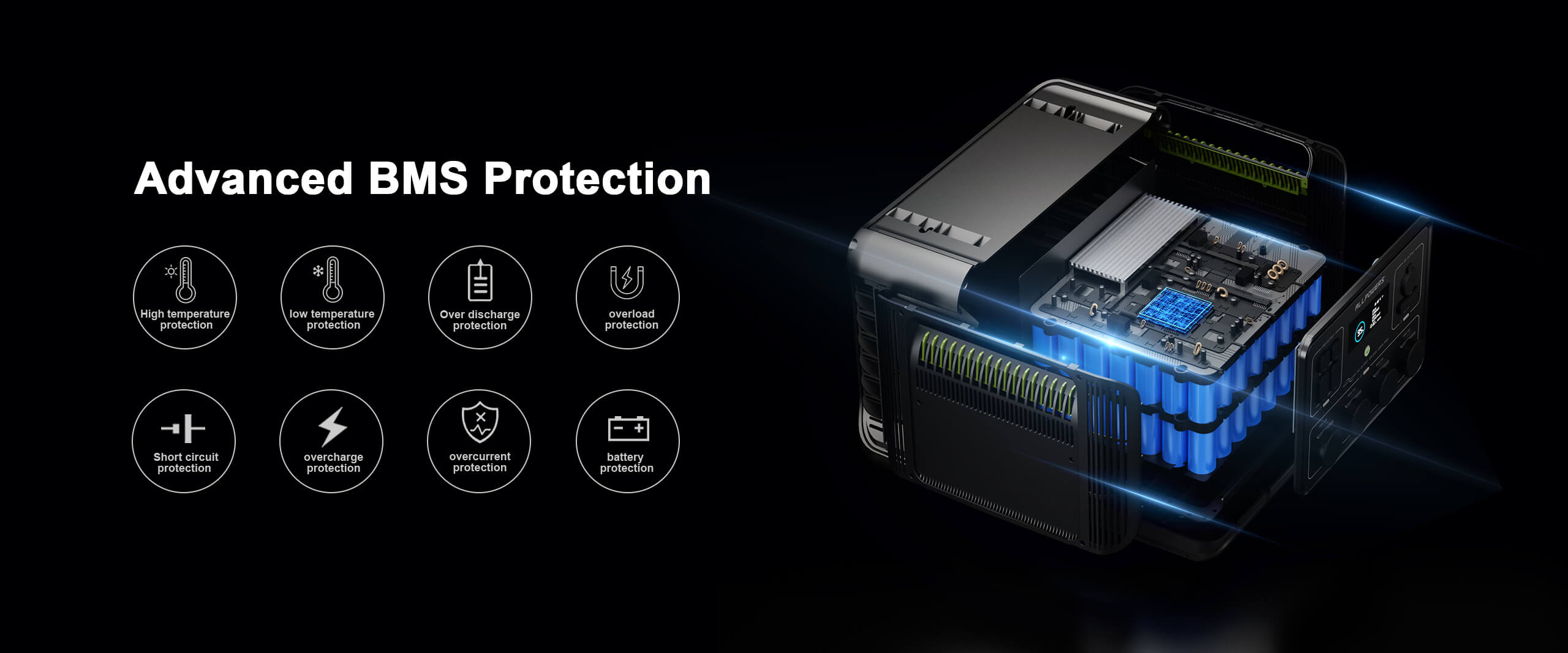 ALLPOWERS R2500 uses a BMS with higher performance than ordinary portable power supplies to properly manage high temperature protection, overvoltage protection, low voltage protection, discharge low temperature protection, overcurrent protection, overload protection, short circuit protection, charging overvoltage protection, etc. to ensure user safety.