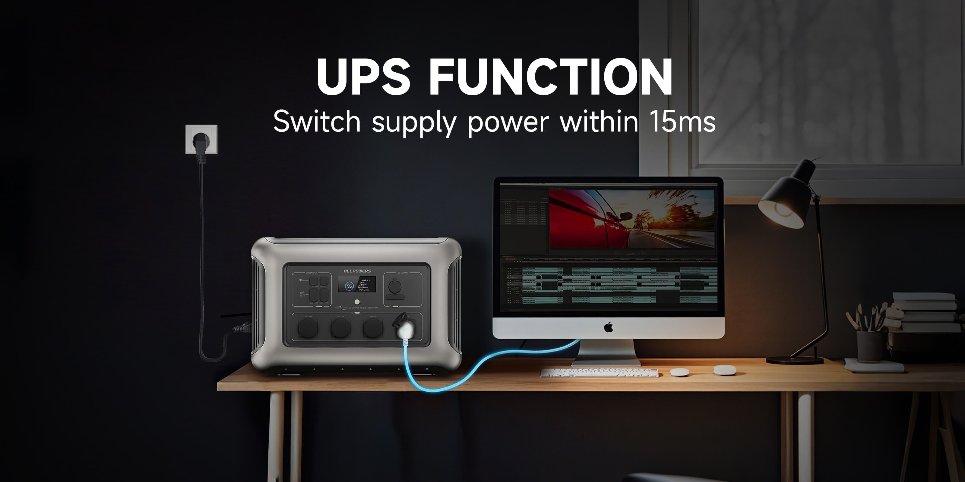 ALLPOWERS R3500 portable power supply is equipped with UPS (uninterruptible power supply). After turning on the UPS function, even if there is a sudden power failure, the connected electrical products will not stop and can be used as they are. There is a momentary interruption when switching, but only 15ms if the switching takes longer.