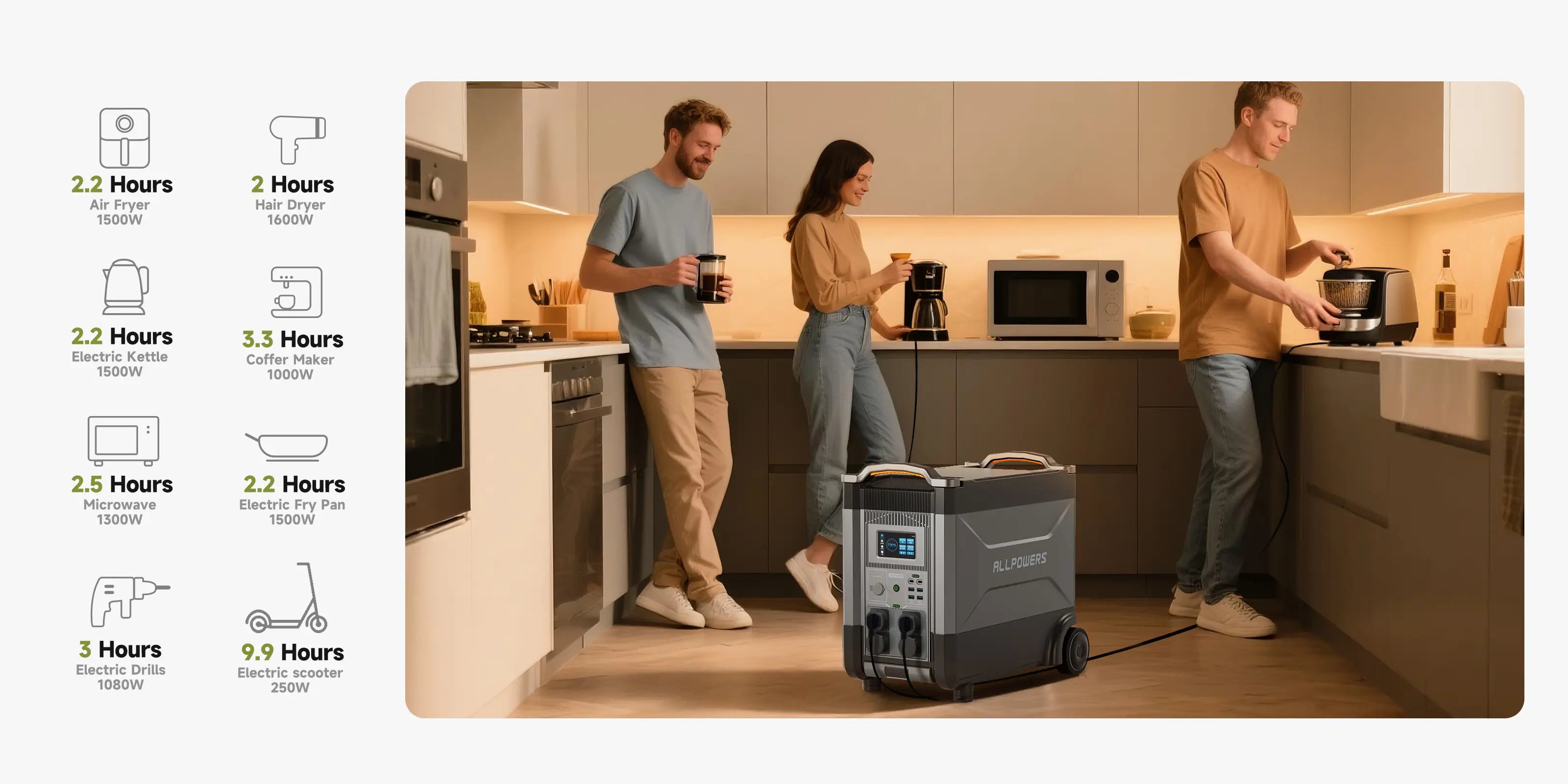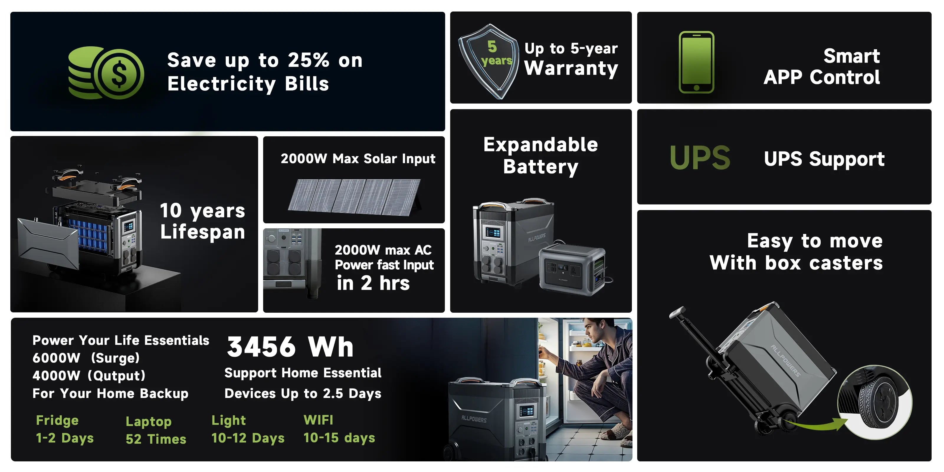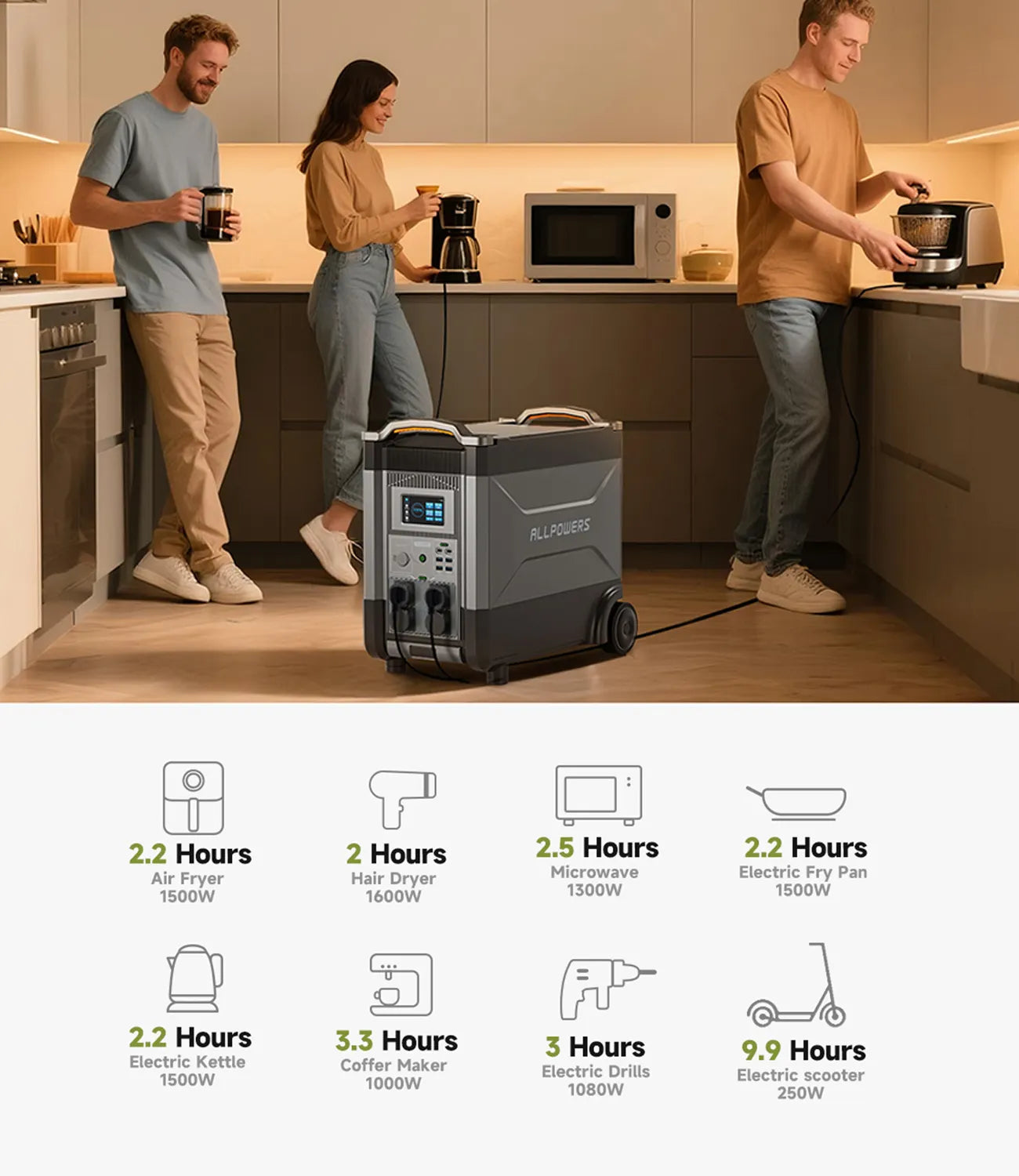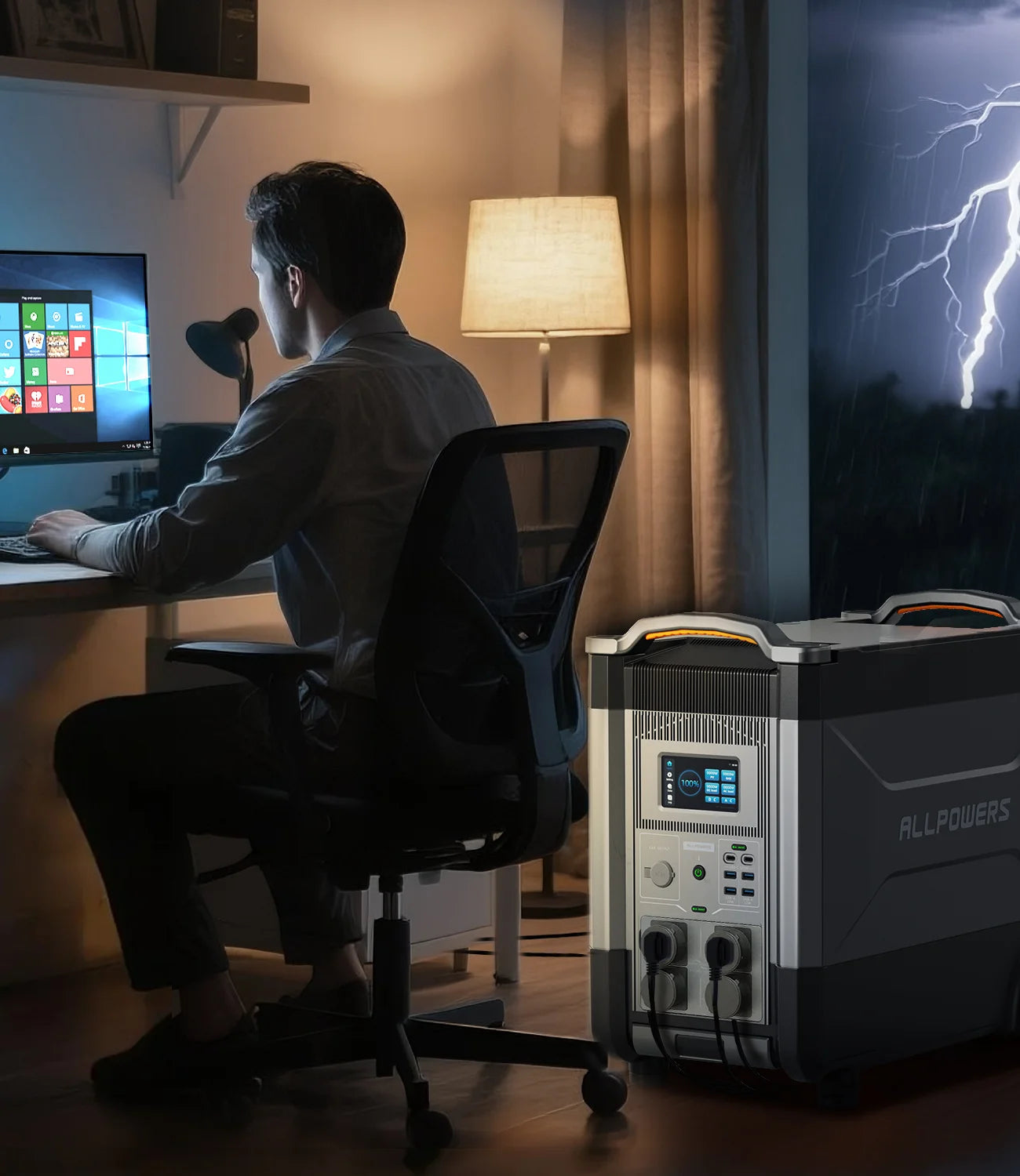 The ALLPOWERS R4000 Portable Power Supply is equipped with a UPS (Uninterruptible Power Supply). When the UPS function is turned on, even if there is a sudden power failure, the connected electrical products will not stop and can be used as usual. R4000 UPS has the function of instantaneous power failure when switching, but if the switching time is long, it is only 15ms. Although the time is short, there is a momentary power failure, so it is not suitable for precision machinery or enterprise systems that handle important data, and you can live without worry.