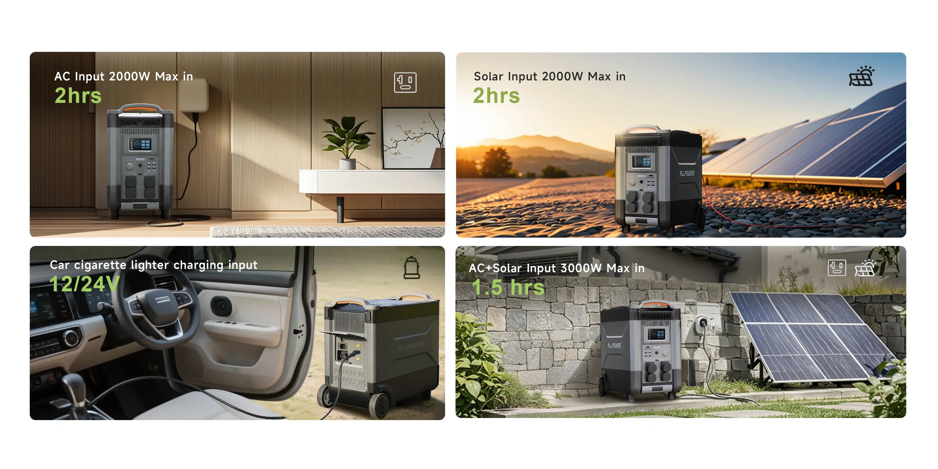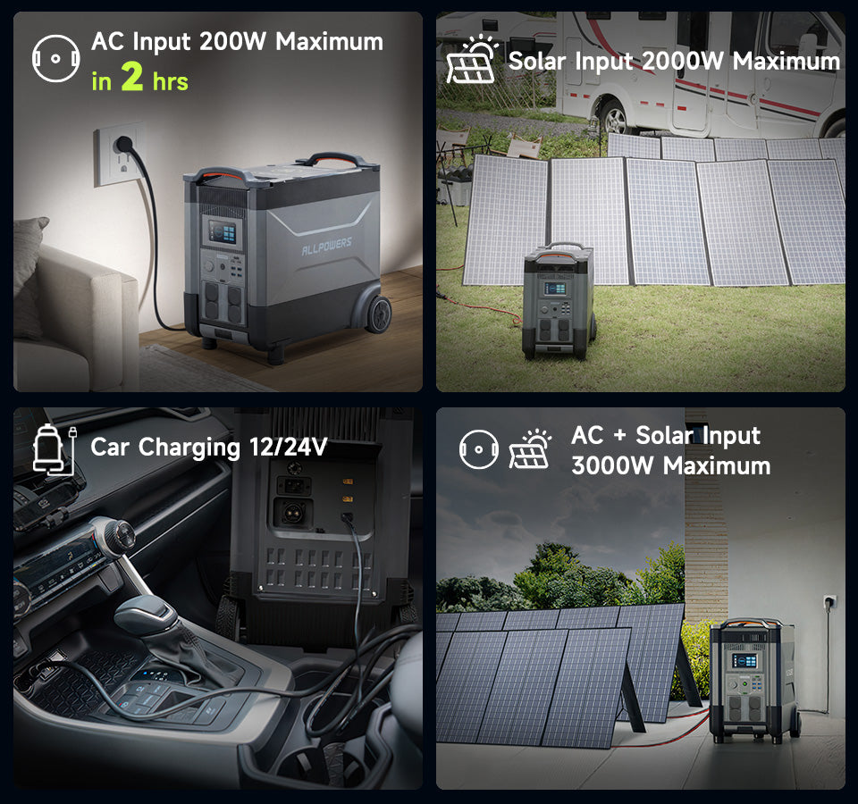 From at-home charging to more on-the-go solutions, we provide five ways to recharge your R4000: AC Charging, Solar Charging, Dual Charging(AC+Solar ), and Car Charging.