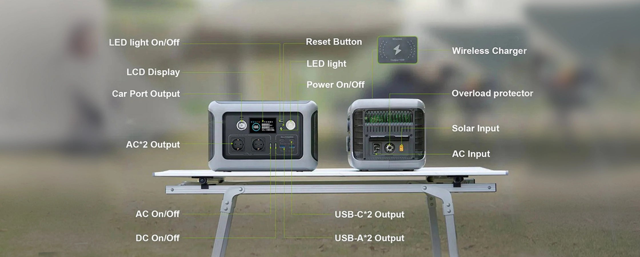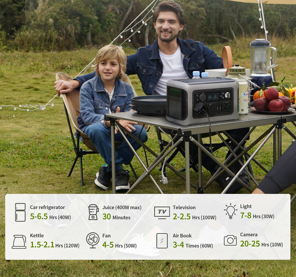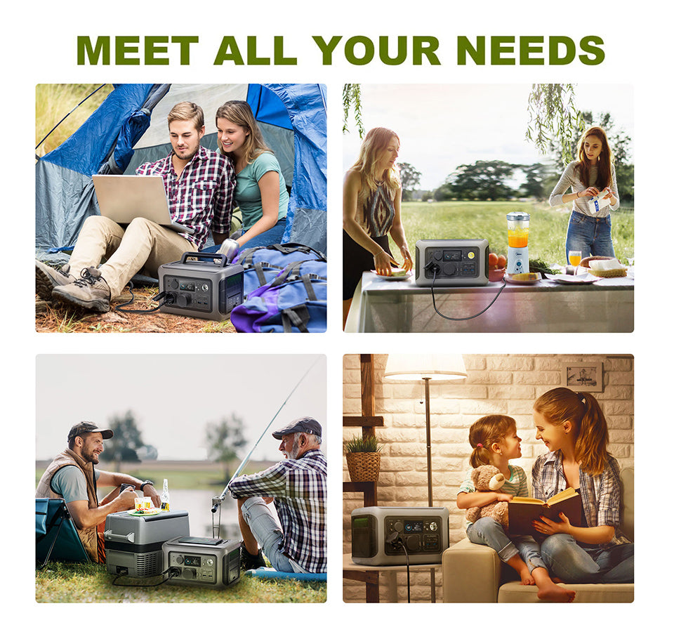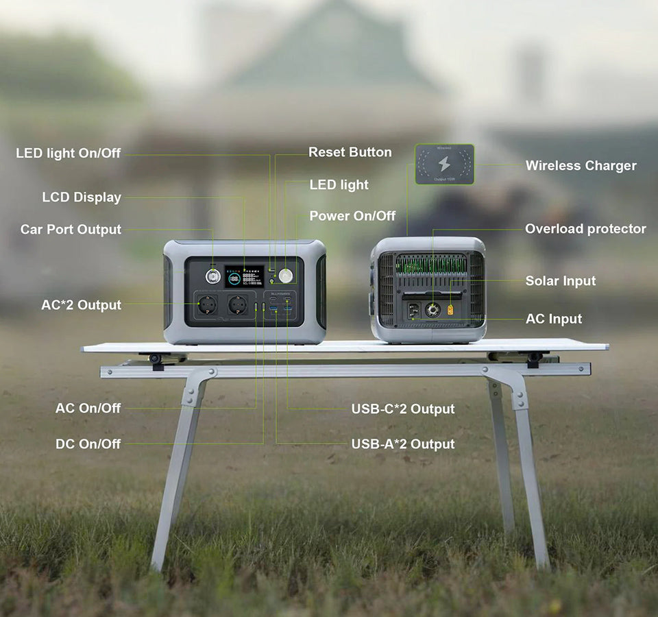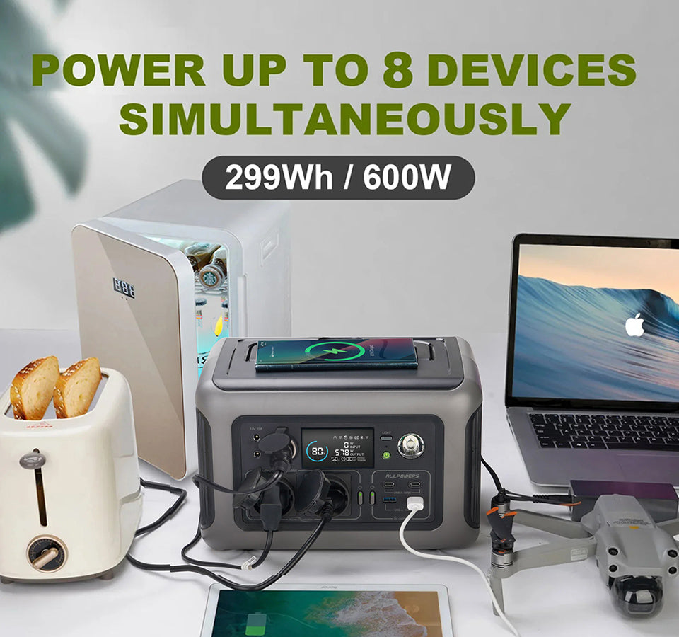 ALLPOWERS portable power station features 2* AC outlets (220V-240v 600W, 1200W Peak), 2 * USB-C ports, 2* USB-A ports and , 1* car cigarette lighter (12V/10A) and a 15W wireless charger . With an output of up to 600W, ALLPOWERS R600 outdoor generator is specially designed for charging kettle, juice, laptops, car refrigerator, drone and other outdoor electronics, power your outdoor adventure without worry.