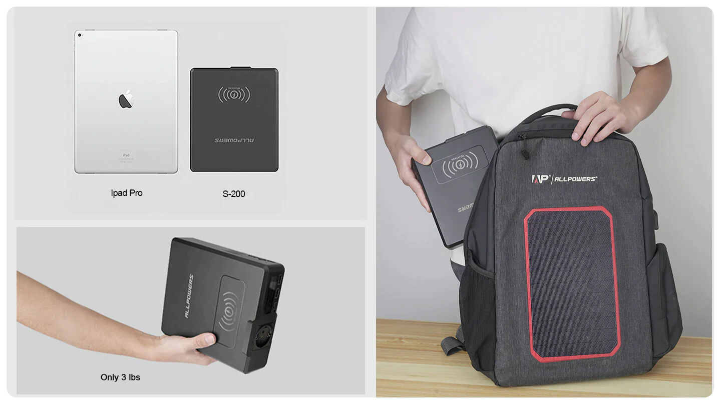 The laptop power bank only weights about 3 lbs with size 7.87*6.7*1.96 inch, easy to put in a bag. 200W/ 154WH /41600mAh capacity allows you to power 3 hours for laptop, 14 times for phone and 8 times for iPad. Ideal external battery for outdoor work, learning in library, laptop using in cafe.