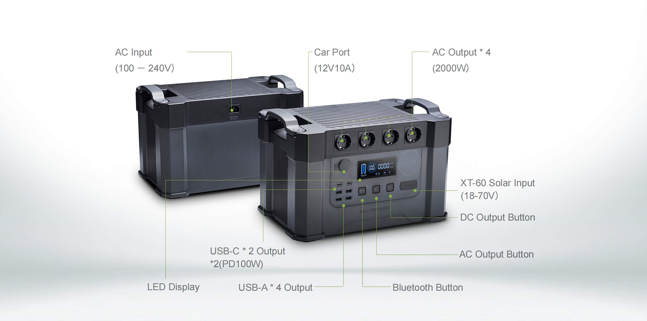 The S2000 comes with a 1500Wh battery pack and has 4* AC outlets (PURE SINE WAVE, 2000W, peak 4000W), 2* PD 100W USB-C ports, 2* USB-A QC3.0 fast charge ports, 2* standard USB-A ports, and 1* Car socket.
