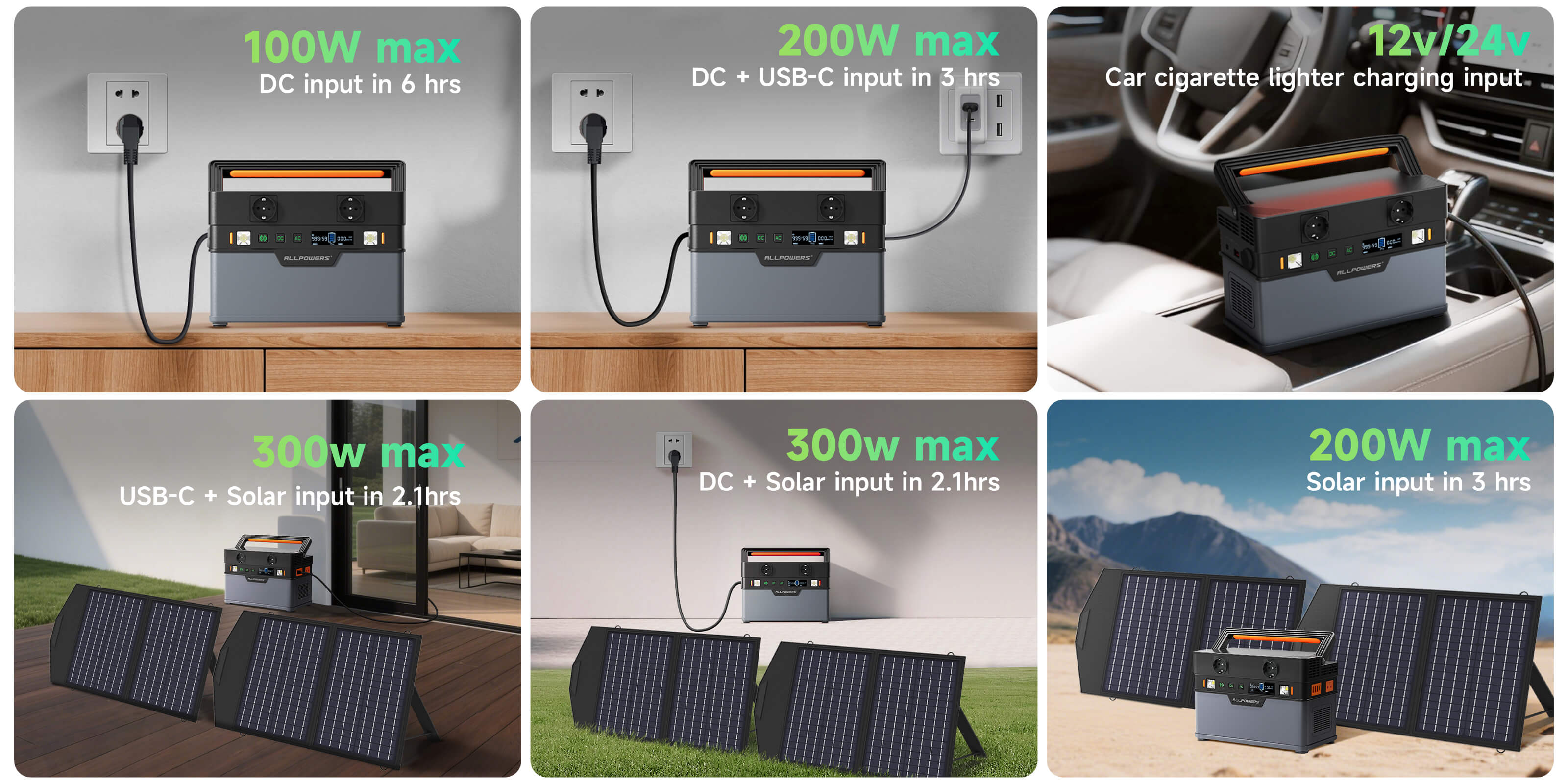 - Multiple charging methods (DC/USB-C/DC+USB-C/solar input/cigarette lighter input/solar input+USB-C or DC);