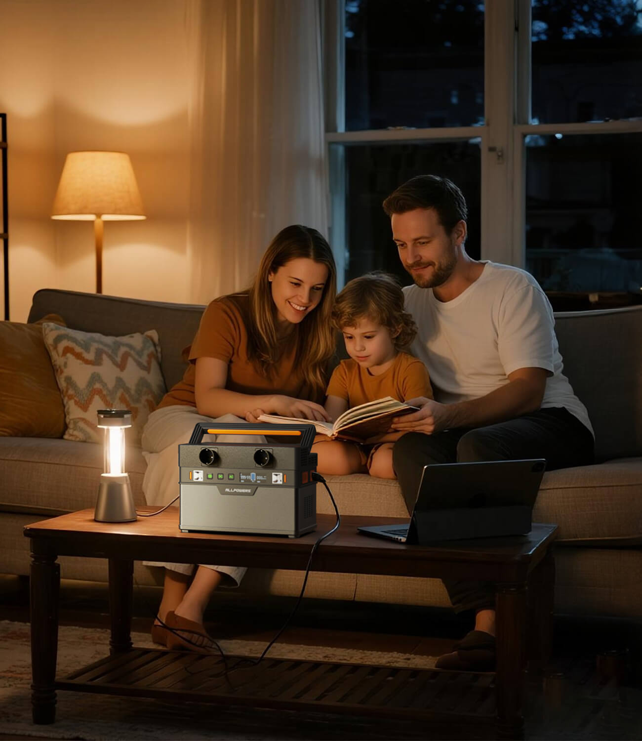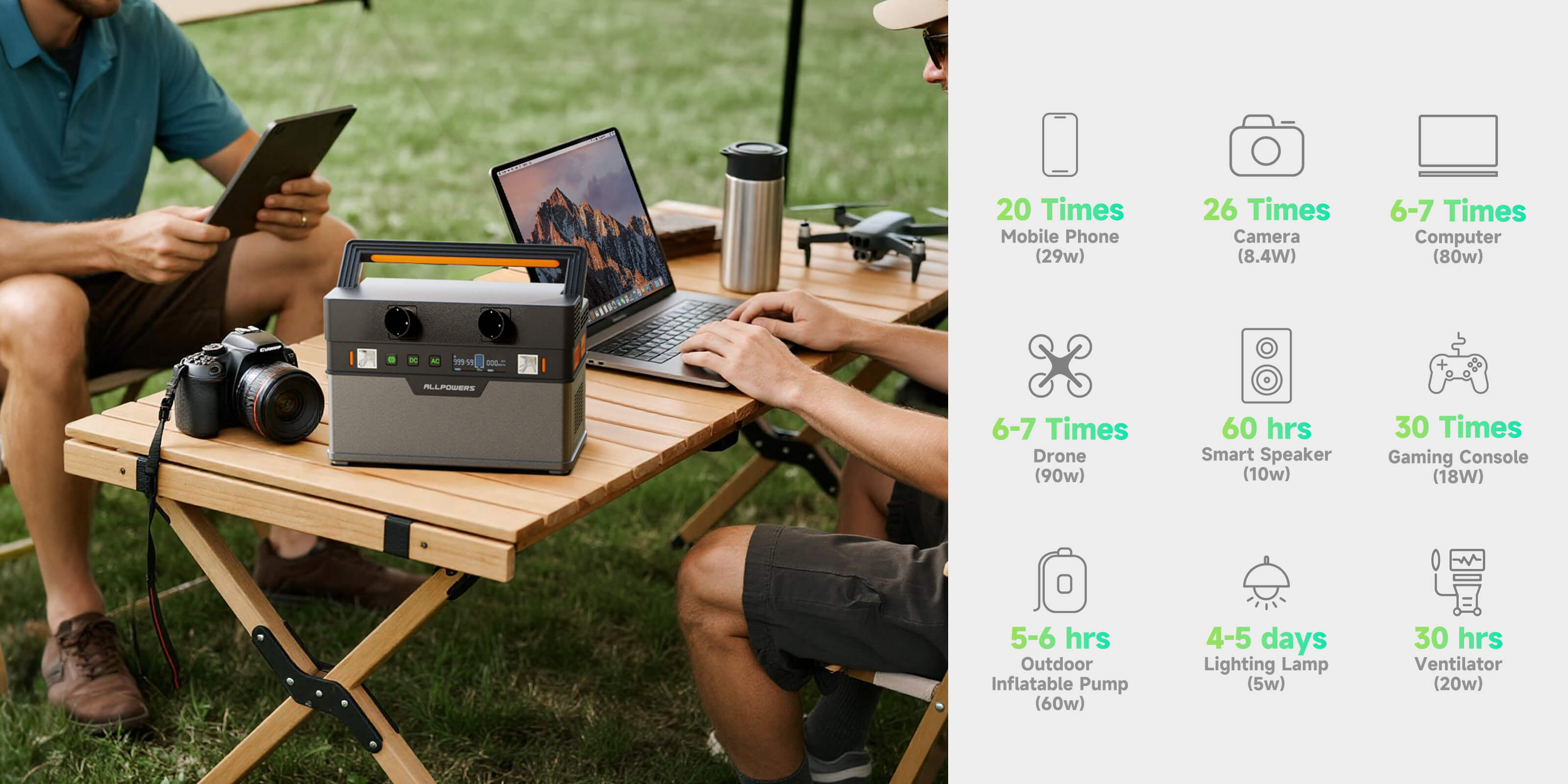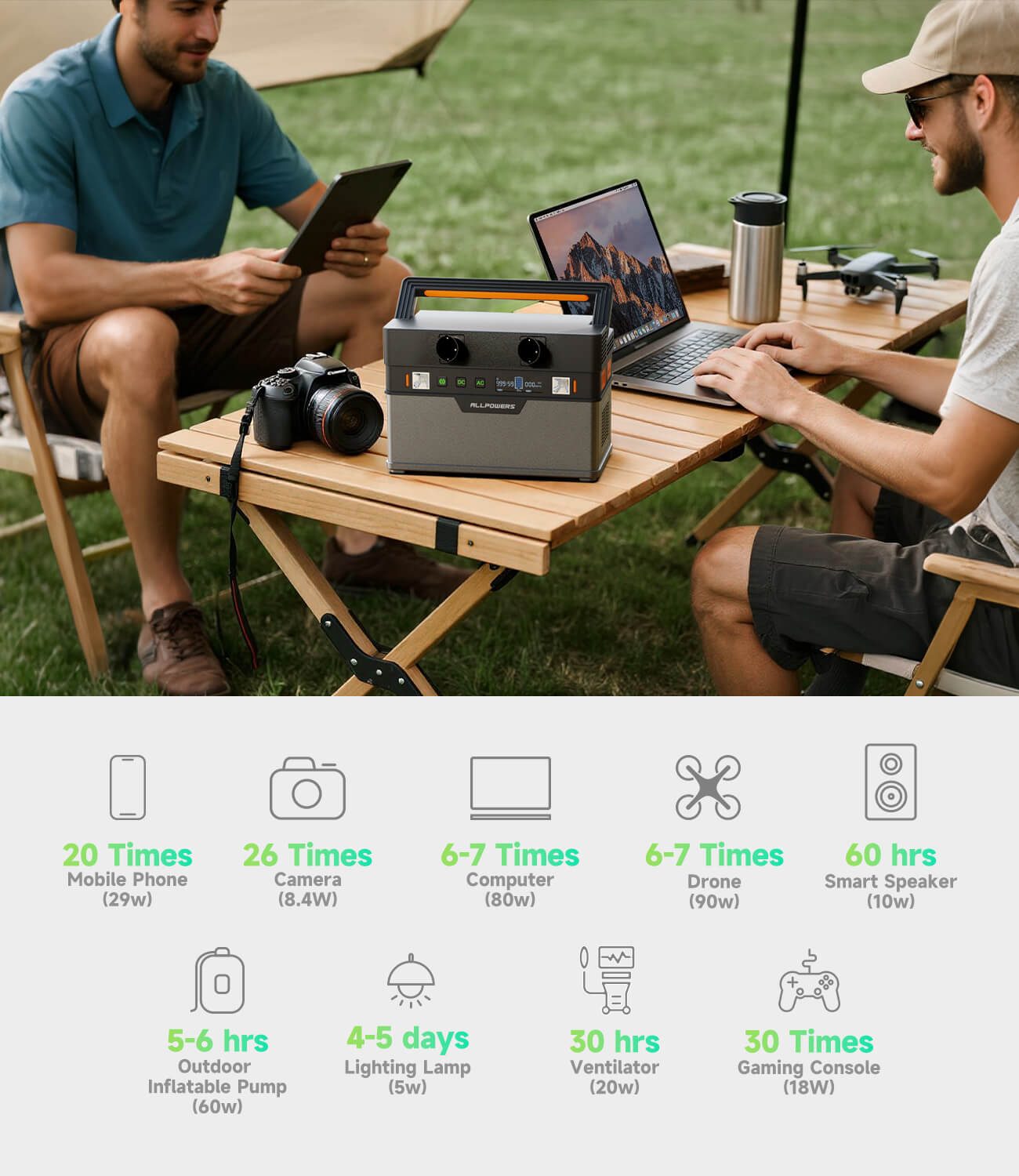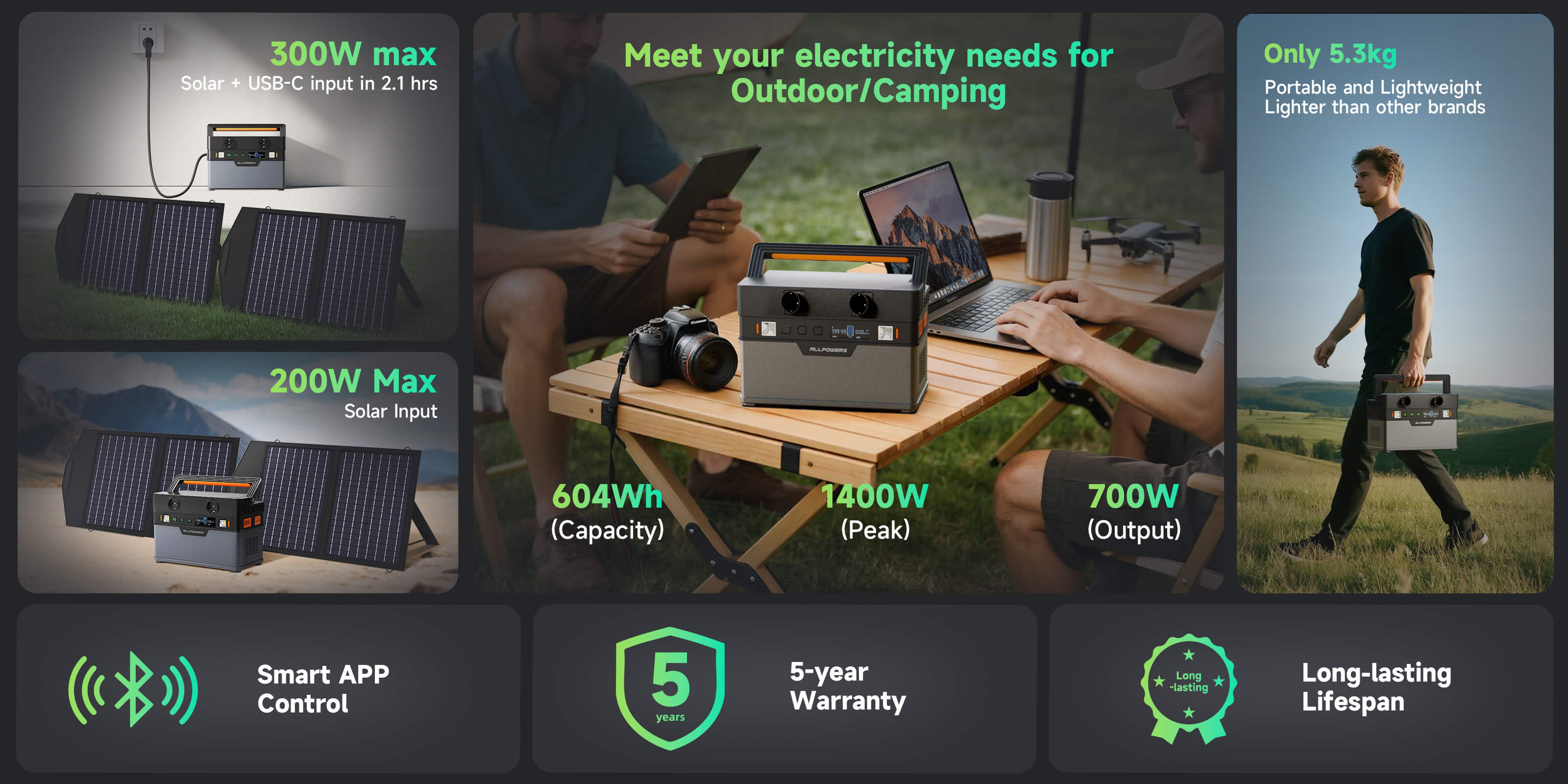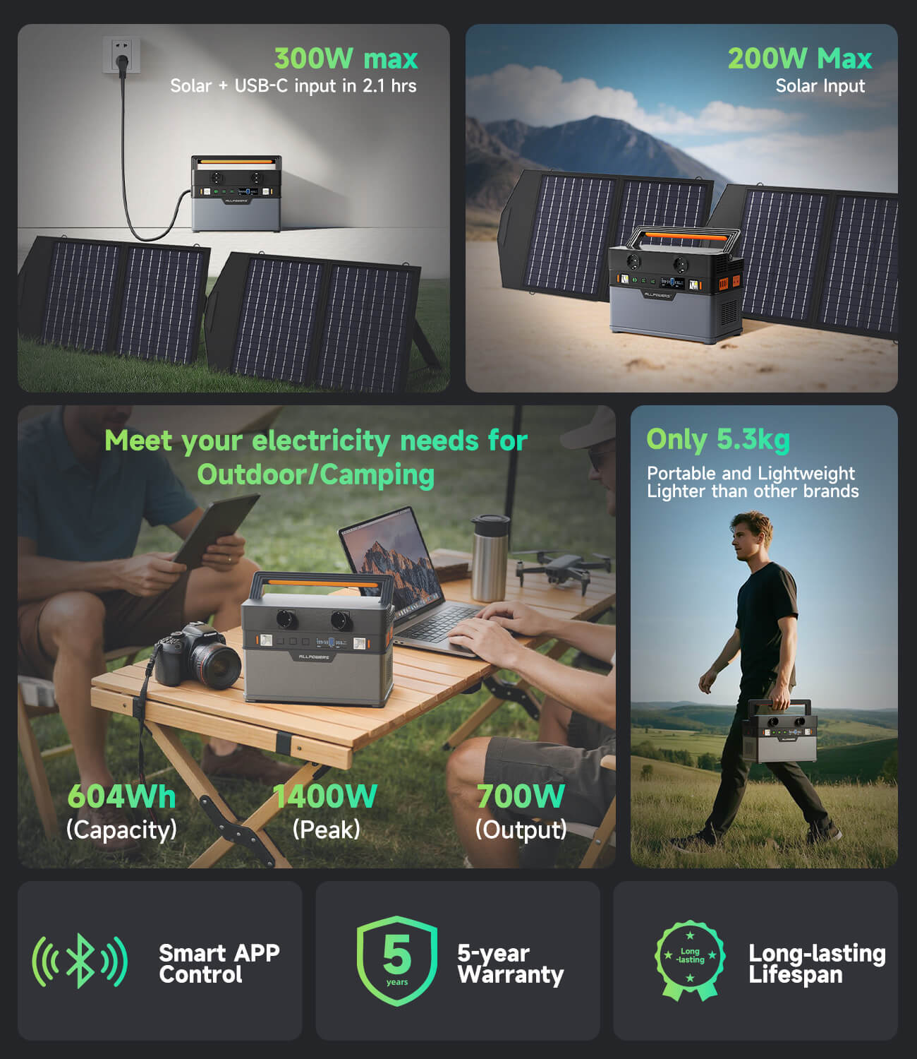 ALLPOWERS S700 is a battery power station packing 604Wh into a light 11.6lbs/5.3kg and small size with a carrying handle design makes the mobile power station for camping really portable. With a 604Wh large capacity higher rated power of 700W, it is ready to power many appliances mini cooler, fan, projector, lamp light, and TV for long time. The built-in lamp can be used as emergency lighting.