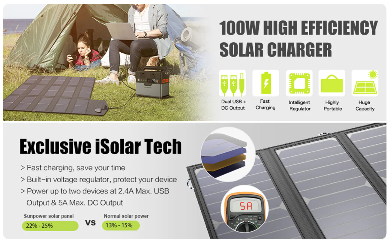 Equipped with the Dual USB Output, 100W solar panel is highly compatible with phones,ipads and other devices.You also could connect the ALLPOWERS S200/S300/S700 poratble power station.