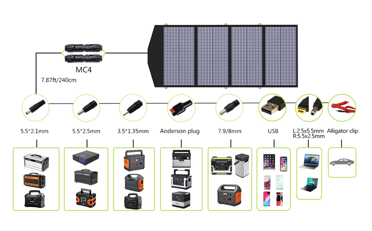Solar Connector Output can deliver 25A(max)current while the DC port only carries 10A, Dual USB port(5V/2.4A per port) for charging your 5V powered gadgets, and 18V DC output(18V/3A) for charging your laptop or 12V car battery and portable generator, the junction box parallel connecting port for connecting multiple foldable solar panels.