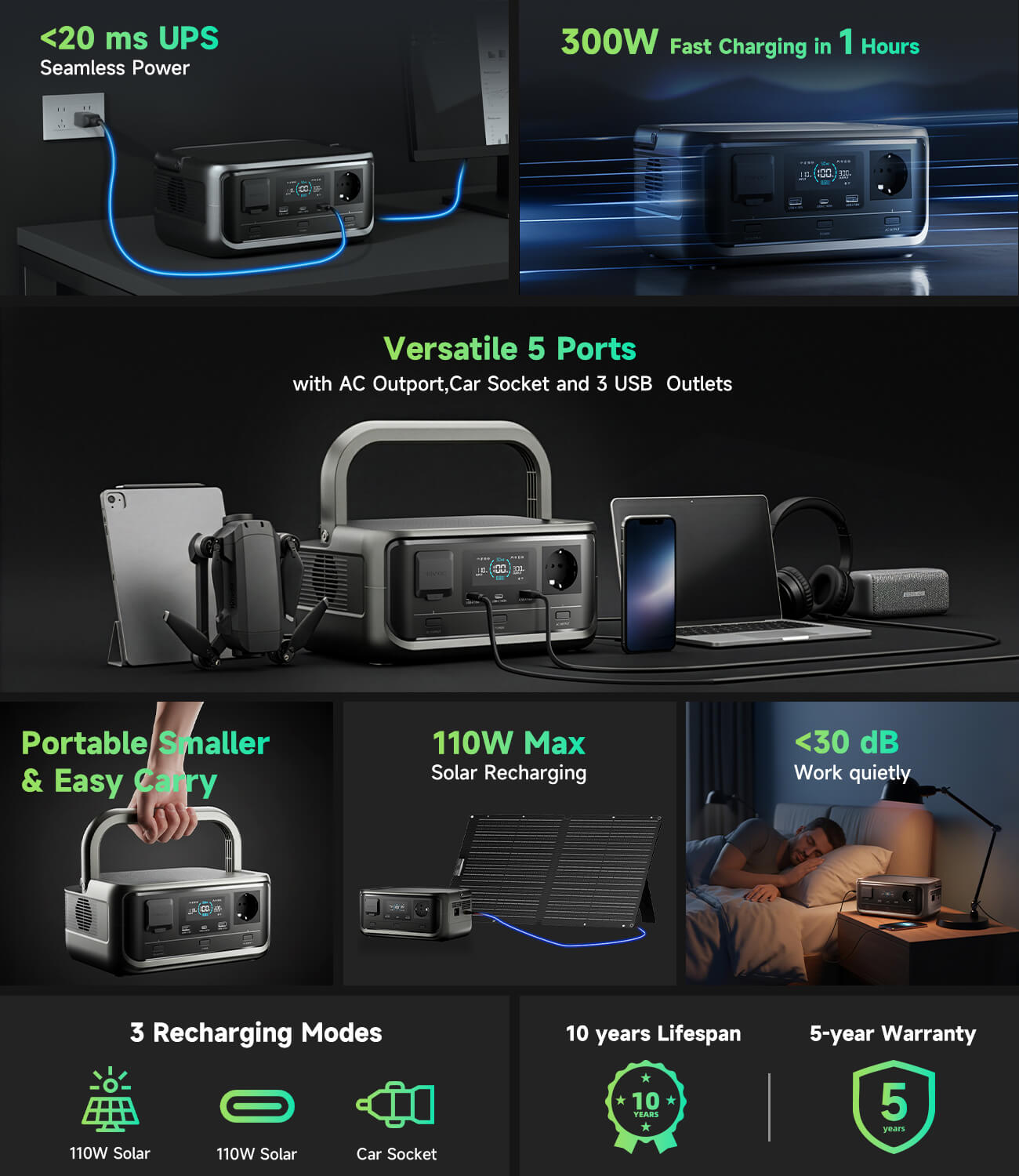 - Ample Capacity & High Power:With a 256Wh capacity and a 300W (600W peak) pure sine wave AC outlet;