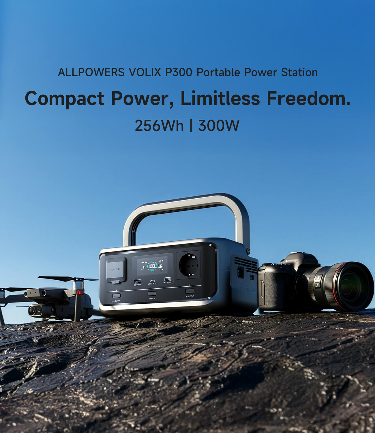 VOLIX P300 Unleash 300W of pure sine wave AC power and a massive 256Wh capacity. With 5 versatile outputs, it simultaneously charges your laptop, drone, camera, mini-cooler, and phone. Ideal for camping trips, home emergencies, and mobile workspaces. Your all-in-one power solution.