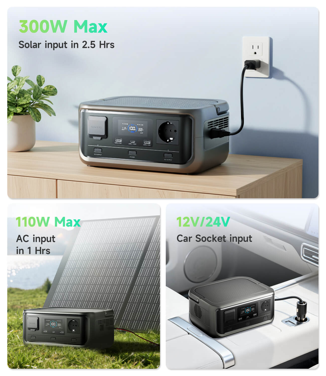 Never be caught without power. The VOLIX P300 gives you unparalleled flexibility with four distinct charging methods:AC Wall Outlet,Solar Panel,12V Car Cigarette Lighter,AC + Solar Simultaneous Charging.Ensuring you can recharge your power station anywhere life takes you—from the comfort of your home to the heart of the wilderness.